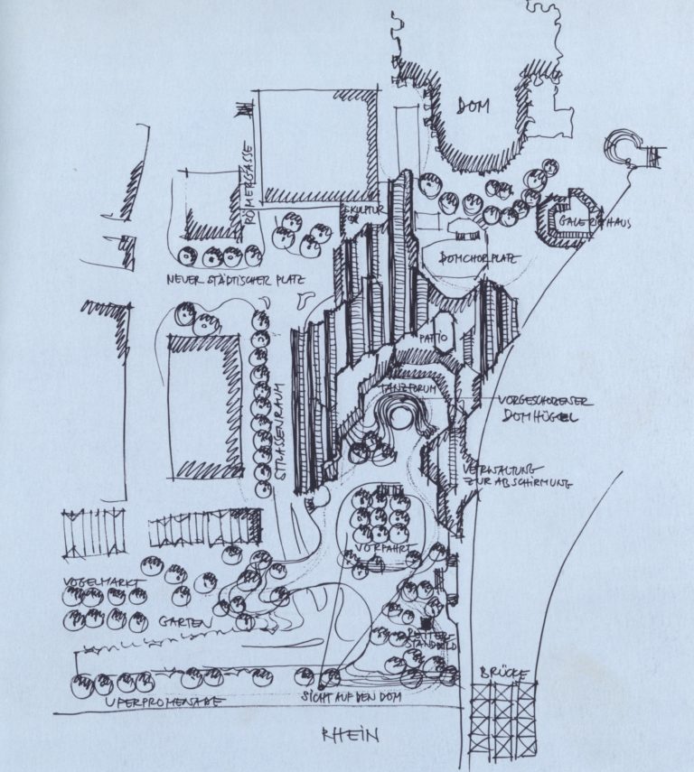 Als das Sammler-Ehepaar Peter und Irene Ludwig der Stadt Köln rund 350 Werke überwiegend der Pop-Art schenkte, „beschloss die Stadt Köln, unter der Direktion von Gerhard Bott, der 1975 sein Amt antrat, zusammen mit dem Stifterehepaar Ludwig, ein eigenes Museum für die Kunst des 20. Jahrhunderts zu etablieren. Das Museum Ludwig wurde gegründet, um zwei Sammlungen unter einem Dach präsentieren zu können: das Wallraff-Richartz Museum und das Museum Ludwig. Für beide Museen sollte ein gemeinsamer Neubau errichtet werden. Die Überlegungen dazu wurden kontrovers diskutiert“[5], denn gleichzeitig war „die Domplatte […] fertig[gestellt worden], das Römisch-Germanische Museum eröffnet und die neue Stadt hatte deutlich Gestalt angenommen. Doch klaffte zwischen Dom und Rhein eine Lücke. Hier sollte ein großes Zeichen gesetzt werden: ein Komplex aus zwei Museen und einer Philharmonie. Gut hätten es auch drei Häuser an drei Standorten werden können, doch die Stadt wollte das eine große Projekt und damit auch noch ein städtebauliches Problem lösen: Zwischen der Kante der Domplatte im Osten und der Rheinuferstraße hatte sich ein Vakuum gebildet, das als Bushof genutzt wurde. Geballte Kultur schien ein geeignetes Mittel, den Stadtgrundriss mit Masse und Inhalt zu füllen. So lobte die Stadt […] 1975 einen Ideenwettbewerb aus“, obwohl sie eigentlich selbst nicht recht daran glaubte die städtebauliche Situation so in den Griff zu bekommen.[6]