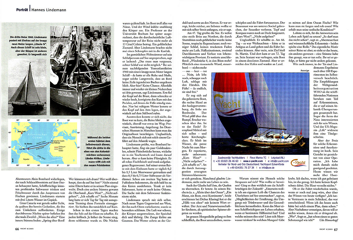 - Udo Hinnerkopf: Kurs West! Nicht aufgeben! (Teil 1) und (Teil 2) in Yacht 8/2005; Porträt Lindemanns anlässlich des 50. Jahrestags der Atlantikquerung, mit Bildmaterial